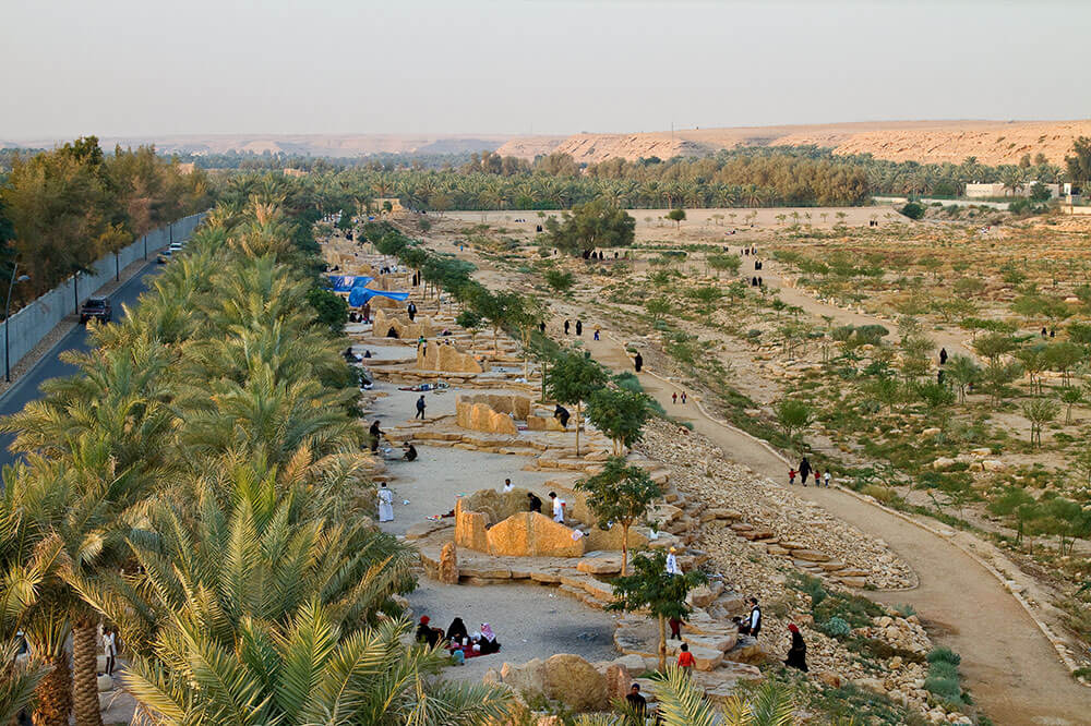 After rehabilitation of the valley stream and the permanent channels were rehabilitated, the development phase of selected areas comes. These areas are characterized by natural composition. Nine different sites were chosen in the valley’s belly; the north of the Dir’iya dams, the Wadi Hanifa dam and the Eid mosque in Budaiya, in the field of Algeria, Al-Bajiri dam, Al-Masaneh neighborhood, Al-Jazaa lakes, Lebanon dam and Namar dam.