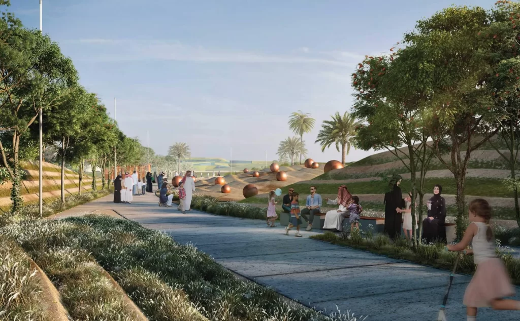 وتقام حديقة الملك سلمان على مساحة تتجاوز 16 كيلو مترًا مربعًا لتصبح أكبر حدائق المدن في العالم، وتقدم مجموعة واسعة من الخيارات والأنشطة النوعية لسكان المدينة وزائريها، حيث تضم مناطق خضراء ممتدة وأكثر من مليون شجرة، وساحات مفتوحة تزيد مساحتها عن 11.6 كيلومتر متر مربع، إضافة إلى المجمع الملكي للفنون والمسرح الوطني ومسار دائري للمشاة بطول 7.2 كيلو متر، ومنطقة “الوادي” التي تتوسط الحديقة ومجموعة من العناصر المائية والمعالم والأيقونات الفنية، وستُسهم الحديقة بدورٍ كبير في زيادة الغطاء النباتي في المنطقة ورفع مُعدّل نصيب الفرد من المساحات الخضراء ممّا ينعكس بشكل مُباشر وإيجابي على جودة البيئة والمناخ.