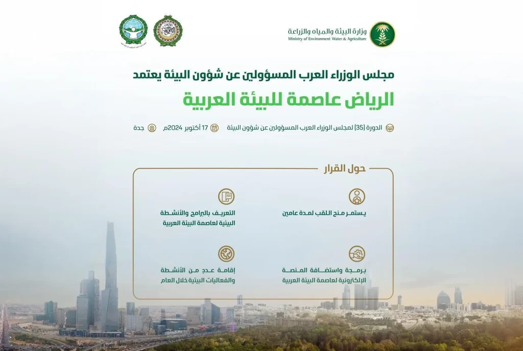 توجت العاصمة السعودية الرياض بلقب “عاصمة البيئة العربية” لمدة عامين، وذلك خلال فعاليات الدورة الـ 35 لمجلس الوزراء العرب المسؤولين عن شؤون البيئة، التي ترأستها المملكة واختتمت أعمالها اليوم في مدينة جدة؛ وذلك تقديرًا لجهودها الرائدة في مجال الحفاظ على البيئة وتعزيز الاستدامة.