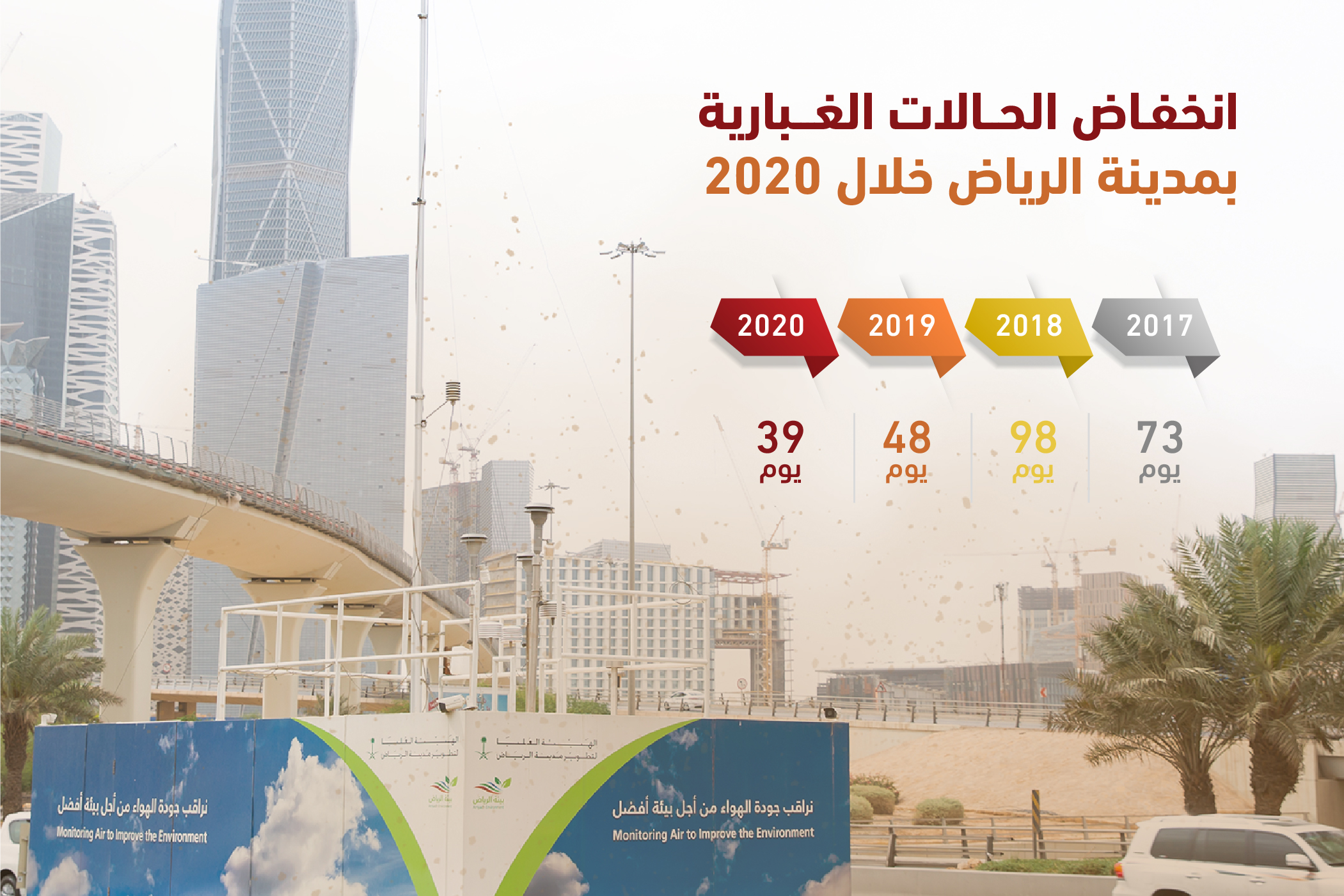 شهدت مدينة الرياض انخفاضًا في الحالات الغبارية خلال عام 2020 مقارنة بالأعوام السابقة، وفقًا لبيانات محطات جودة هواء الرياض.
