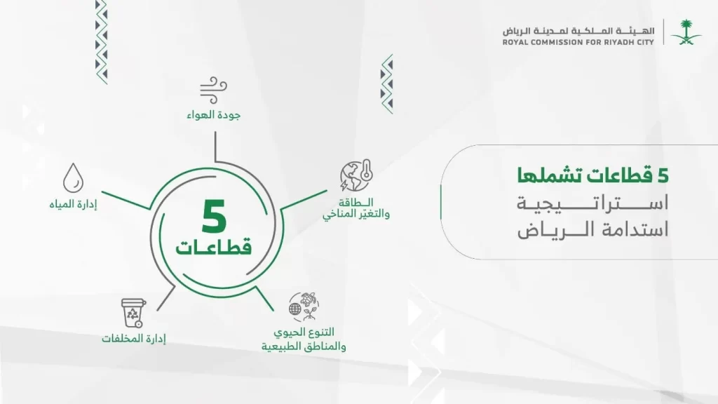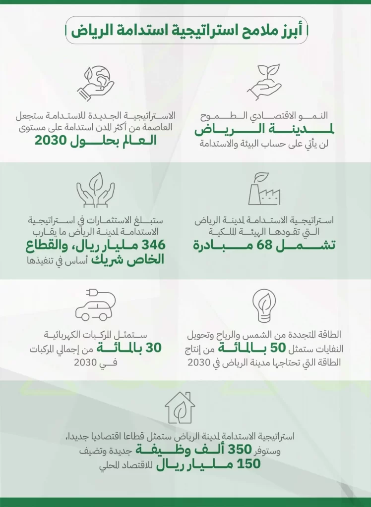 هذا وأعلنت الهيئة الملكية لمدينة الرياض أن إستراتيجية الرياض للاستدامة التي أطلقت اليوم من قبل سمو ولي العهد رئيس مجلس الوزراء رئيس مجلس إدارة الهيئة الملكية لمدينة الرياض – حفظه الله تشمل إطلاق أكثر من 68 مبادرة طموحة للاستدامة في خمسة قطاعات، وهي: الطاقة والتغيّر المناخي، وجودة الهواء، وإدارة المياه، وإدارة النفايات، والتنوع الحيوي والمناطق الطبيعية. كما وتستهدف الاستراتيجية خفض انبعاثات الكربون في المدينة بنسبة 50%، بالإضافة إلى ضخ 346 مليار ريال سعودي (92 مليار دولار أمريكي) في مبادرات ومشاريع الاستدامة للمدينة وتحفيز القطاع الخاص بفرص استثمارية.